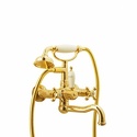 Назначение: ванна+душ • Конструкция: двухрычажный • Монтаж: вертикальный • Материал: покрытие - золото • Подводка: жесткая • Монтажные отверстия: 2 отверстия • Форма излива: традиционная • Душевая лейка в комплекте: есть • Держатель для душевой лейки: на смесителе