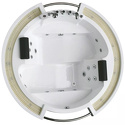 Материал: акрил • Расположение: отдельно стоящая, угловая конструкция • Форма: четверть круга • Количество мест: двухместная • Гидромассаж: есть • Аэромассаж: есть • Озонирование: есть • Подсветка: есть • Комфорт: подголовник • Смеситель в комплекте: есть • Размеры (ДxШxВ): 150x150x70 см