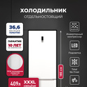 отдельностоящий • полный No Frost • электронное управление • класс A+ • полезный объём: 409 л (267 + 142 л) • инверторный компрессор • зона свежести • перенавешиваемые двери • лоток для яиц • 59.5x68x185 см • белый