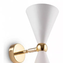 Бра стиля модерн для гостиной, кабинета или спальни имеет размеры 120х320х180 мм. Арматура светильника окрашена в золотой цвет. Лампы в комплекте - отсутствуют. В светильнике применяются лампы накаливания или светодиодная LED-лампа. Цвет плафонов - белый, с матовой поверхностью. Материал плафонов - металл. Класс электробезопасности - I, степень пылевлагозащиты (IP) - 20. Максимальная мощность лампы (Вт) - 40. Светильник размещается на стене.