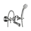 Назначение: ванна+душ • Конструкция: двухрычажный • Монтаж: вертикальный • Клапан: керамический • Материал: покрытие - хром • Подводка: жесткая • Монтажные отверстия: 2 отверстия • Форма излива: традиционная • Душевая лейка в комплекте: есть • Держатель для душевой лейки: на смесителе • Аэратор: есть • Эксцентрики в комплекте: есть • Донный клапан в комплекте: есть